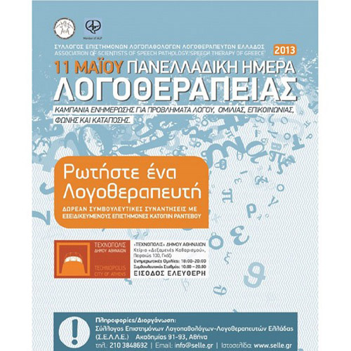 Στην Αθήνα, θα πραγματοποιηθεί Ημερίδα στην «Τεχνόπολις» του Δήμου Αθηναίων, Κτίριο «Δεξαμενές Καθαρισμού», με ομιλίες ενημέρωσης από τις 18:00 έως τις 20:00 από εξειδικευμένους επιστήμονες. Στον ίδιο χώρο, θα λειτουργήσει Ημερήσιος Συμβουλευτικός Σταθμός για δωρεάν προσωπικές συναντήσεις του κοινού με τους λογοθεραπευτές από τις 10:00 το πρωί έως και τις 20:00 το απόγευμα κατόπιν ραντεβού. Οι ενδιαφερόμενοι θα έχουν τη δυνατότητα να θέσουν στους λογοθεραπευτές ερωτήματα και προβληματισμούς πάνω σε θέματα λόγου, ομιλίας, επικοινωνίας των παιδιών και επιπτώσεις στην καθημερινότητά τους (οικογένεια, σχολείο,κοινωνικότητα, αυτοεκτίμηση κλπ), όσο και για θέματα που αφορούν σε προβλήματα λόγου, ομιλίας, επικοινωνίας, φωνής και κατάποσης, σε ενήλικες.
