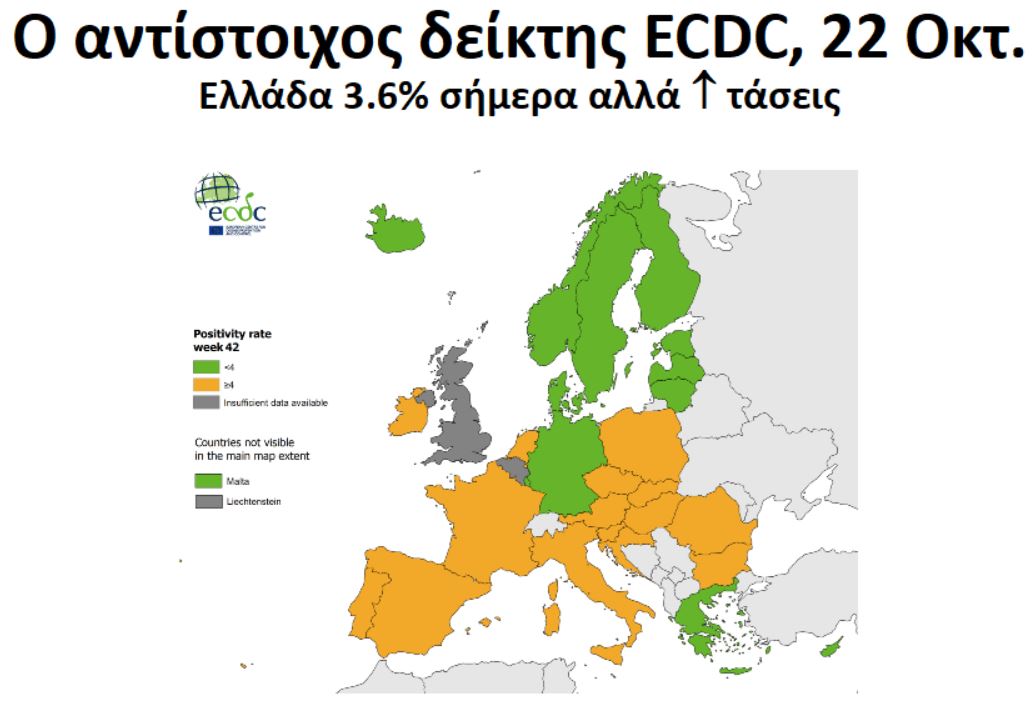 Πρόκειται για τα στοιχεία που εμφανίζουν το ποσοστό των θετικών δειγμάτων ανά αριθμό διενεργούμενων τεστ. Η Ελλάδα βρίσκεται στο 3,6%.