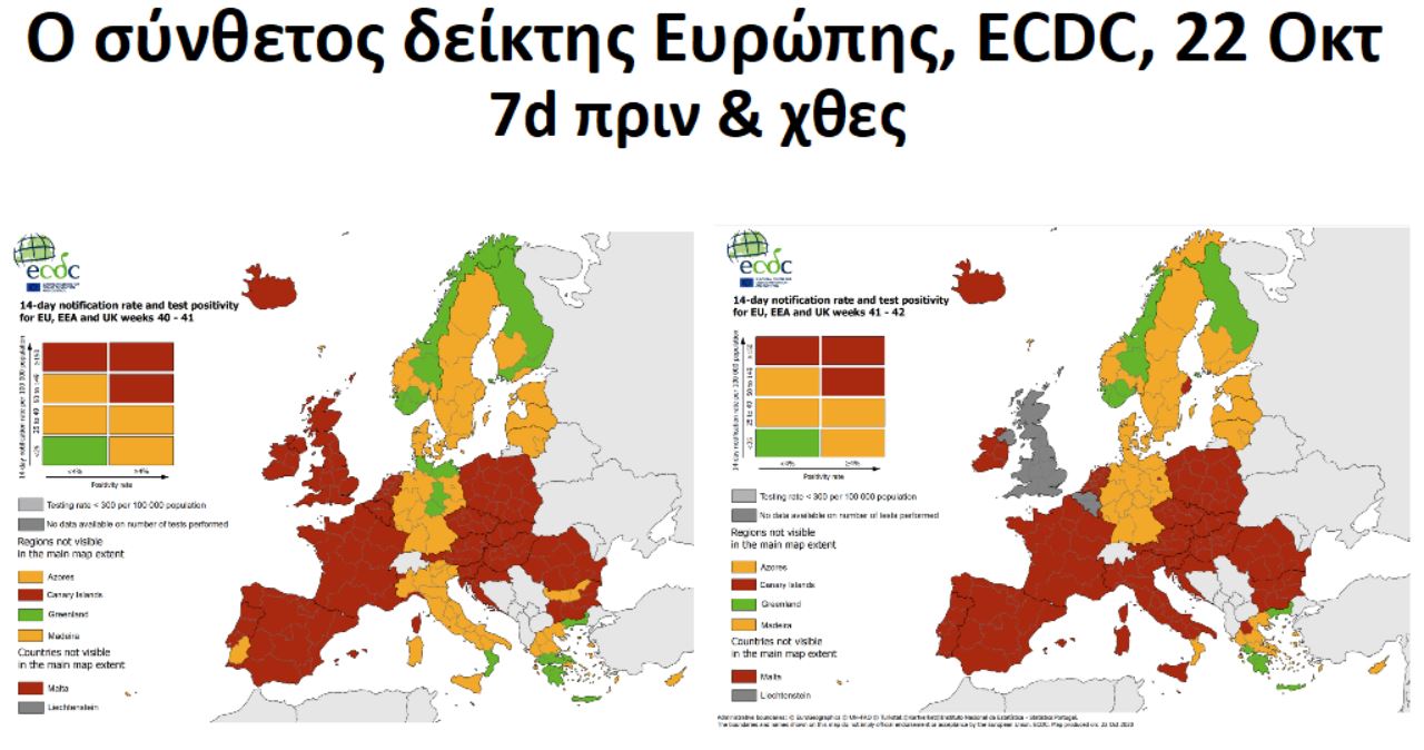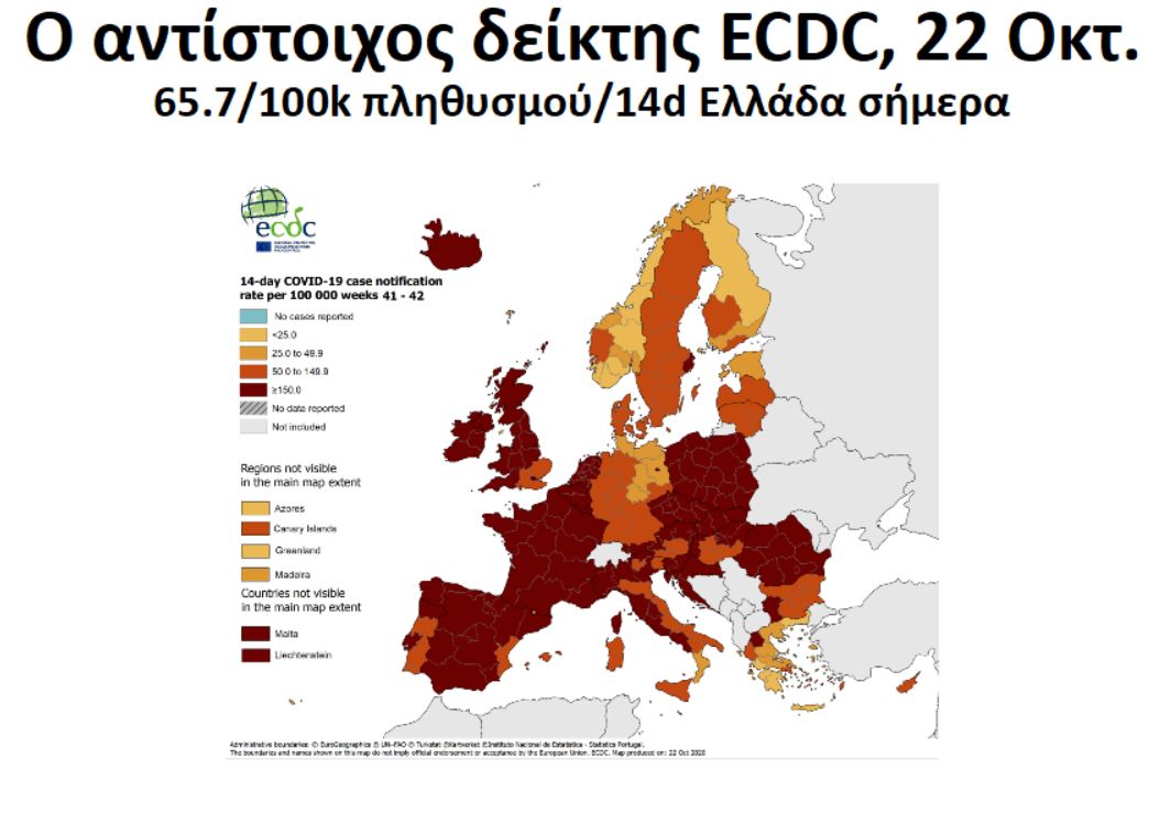 Πρώτος χάρτης που παρουσίασε, ήταν αυτός με το ποσοστό των κρουσμάτων ανά 100.000 πληθυσμού, κατά τις τελευταίες 14 ημέρες. Εκτός από τη Δυτική Μακεδονία, η Ελλάδα εμφανίζει καλύτερη πορεία από τις περισσότερες χώρες της Κεντρικής Ευρώπης.