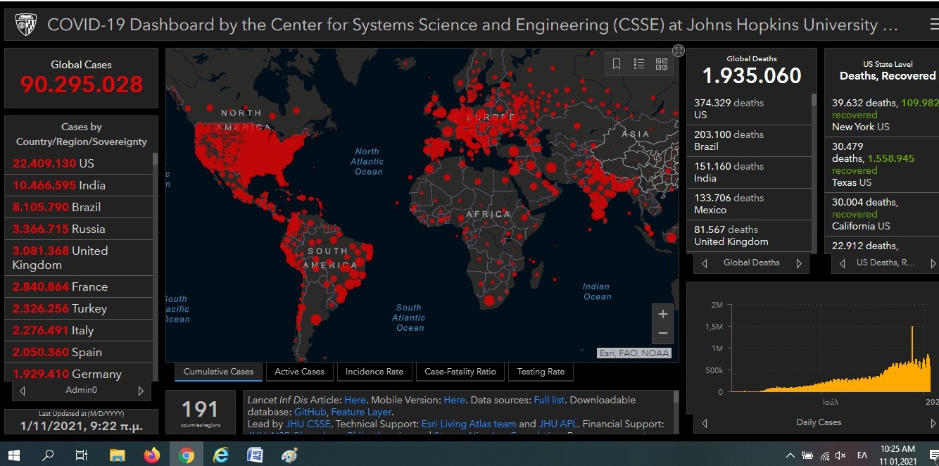 Τους τελευταίους μήνες η διασπορά του έχει επιταχυνθεί και πλέον καθημερινά καταγράφονται εκατοντάδες χιλιάδες νέα περιστατικά. Έτσι, τα κρούσματα έφτασαν στις 09.22′ το πρωί τα 90.295.028, σύμφωνα με το Παγκόσμιο Παρατηρητήριο για τον Κορωνοϊό του Πανεπιστημίου Τζωνς Χόπκινς.
